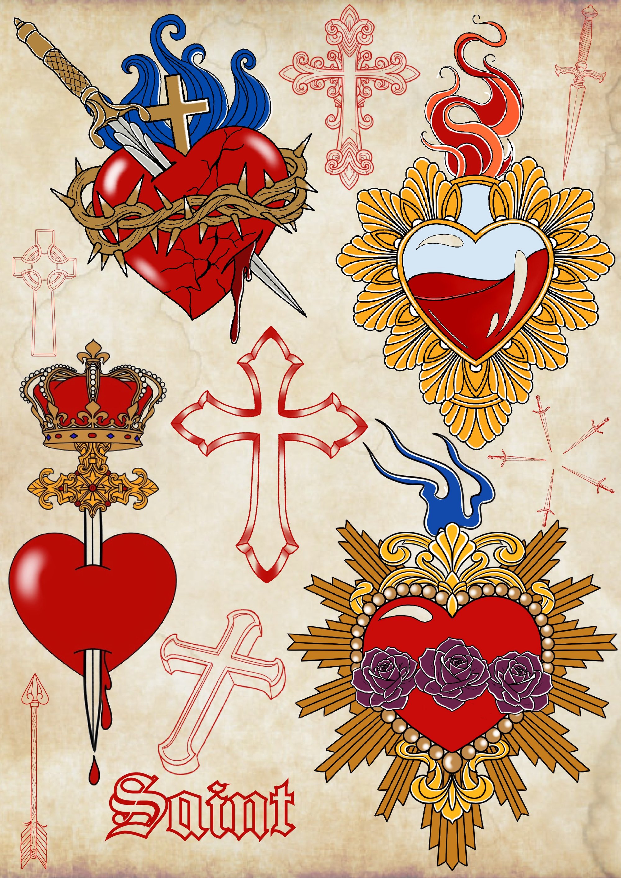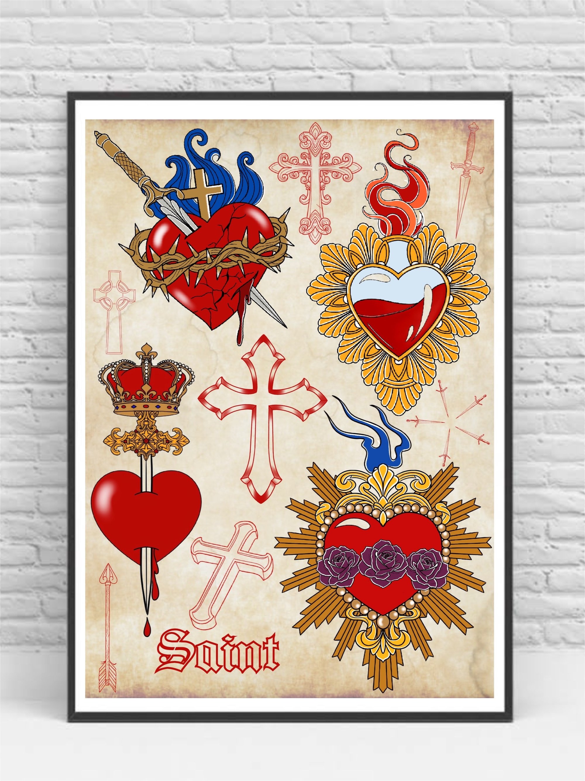 Sacred hearts, crosses, Romeo & Juliet inspired flash tattoo art print
